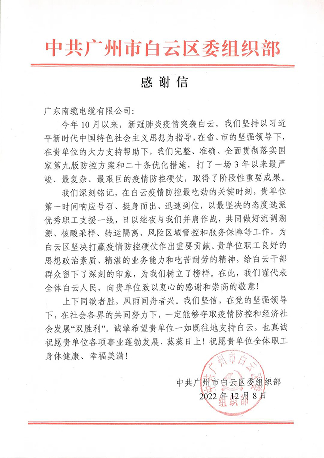 近日,廣東南纜電纜有限公司收到中共廣州市白云區(qū)委組織部的感謝信,信中對南纜電纜熱心、專業(yè)、高效、務(wù)實(shí)的服務(wù)理念表示認(rèn)可,對我司的辛勤付出表示感謝,充分肯定南纜電纜對社會價(jià)值的認(rèn)可。